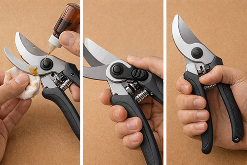 每次使用後用乾布擦拭汁液,黏稠樹脂可用酒精棉片處理。乾燥後在刀刃與轉軸滴上潤滑油,確保性能不受濕氣威脅。