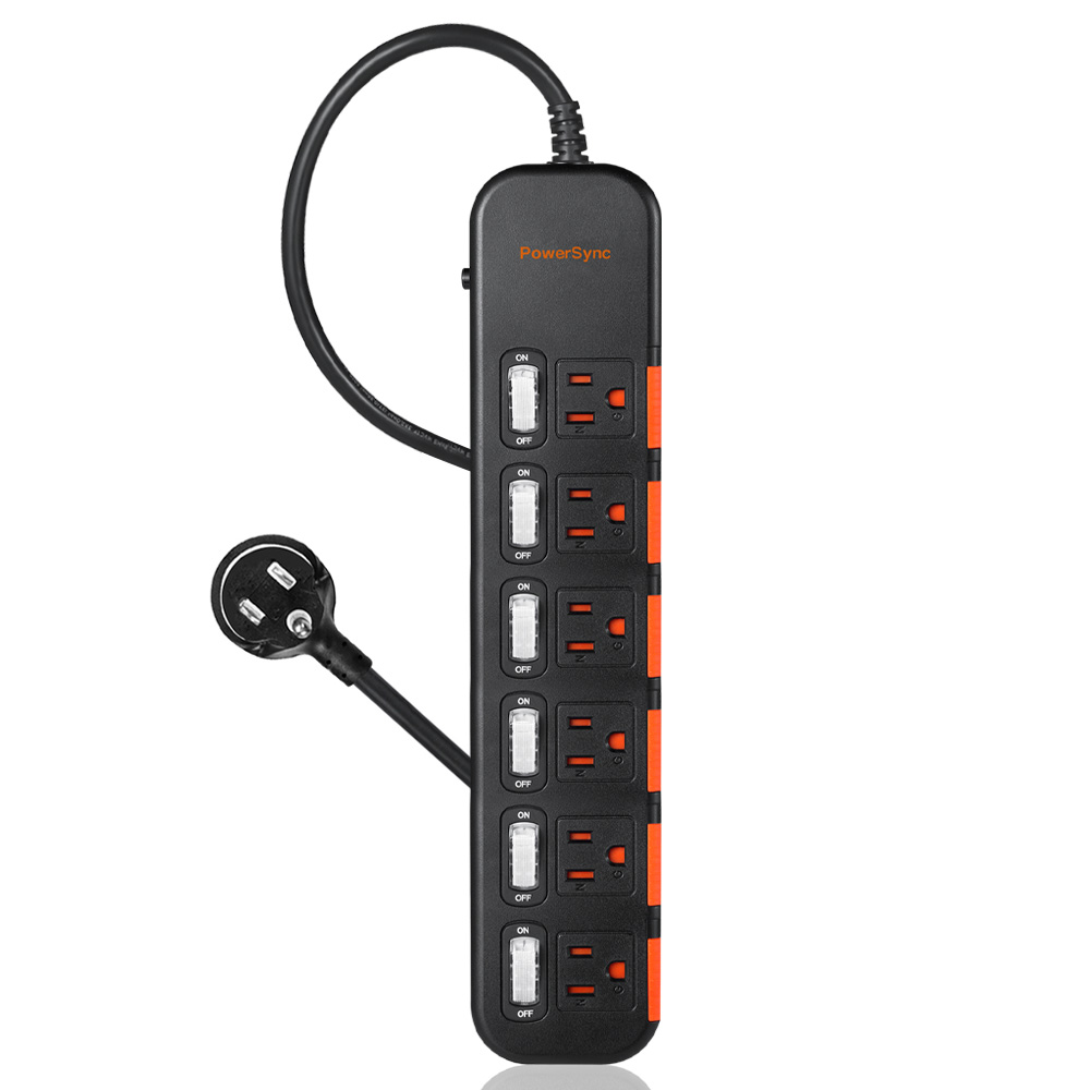 六開六插滑蓋防塵防雷擊延長線-黑色