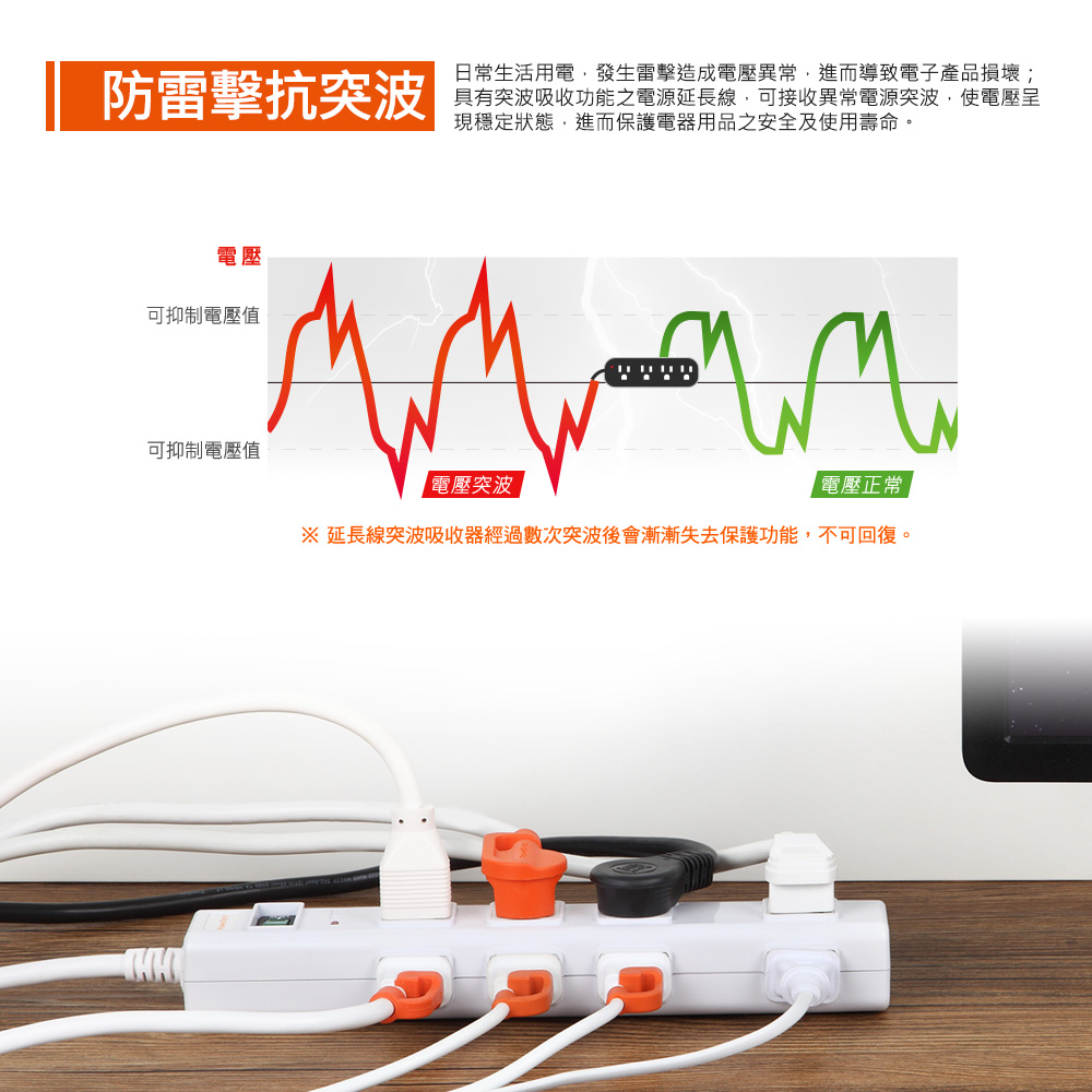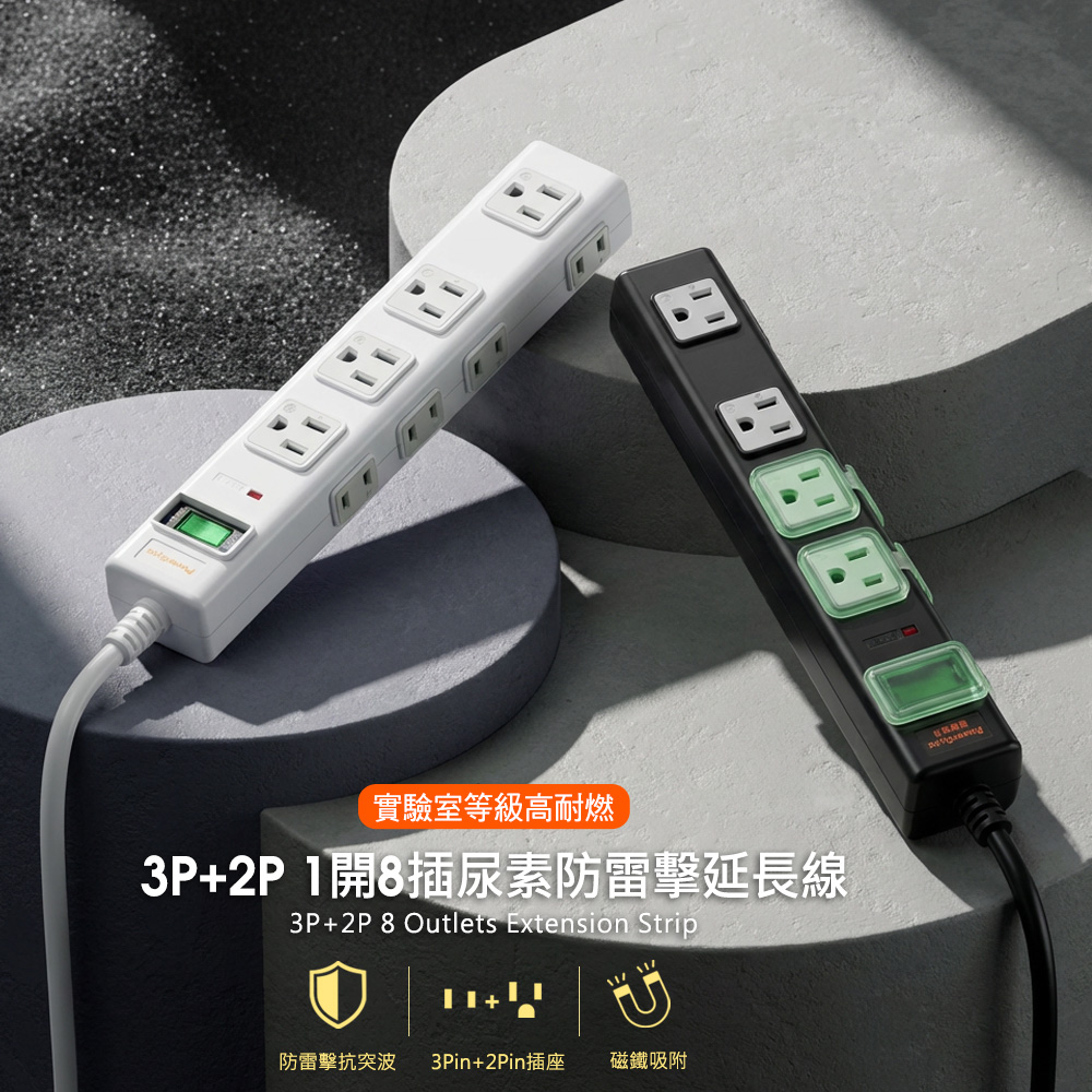 ● 品名:高耐燃3P+2P 8插尿素防雷擊延長線(白色)