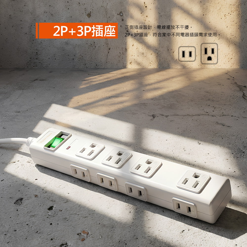 ● 品名:高耐燃3P+2P 8插尿素防雷擊延長線(白色)