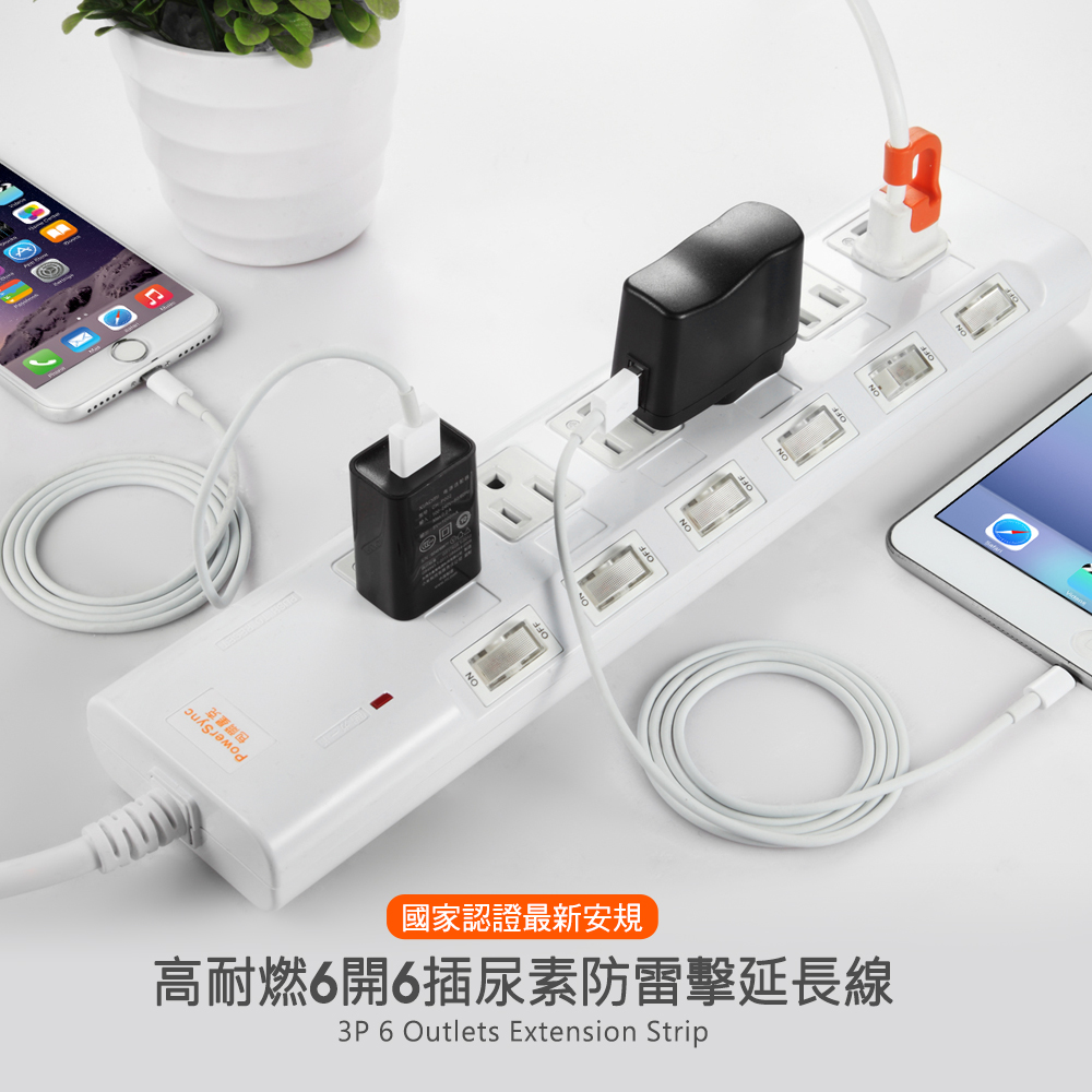 高耐燃六開六插尿素防雷擊延長線(磁鐵固定)白色