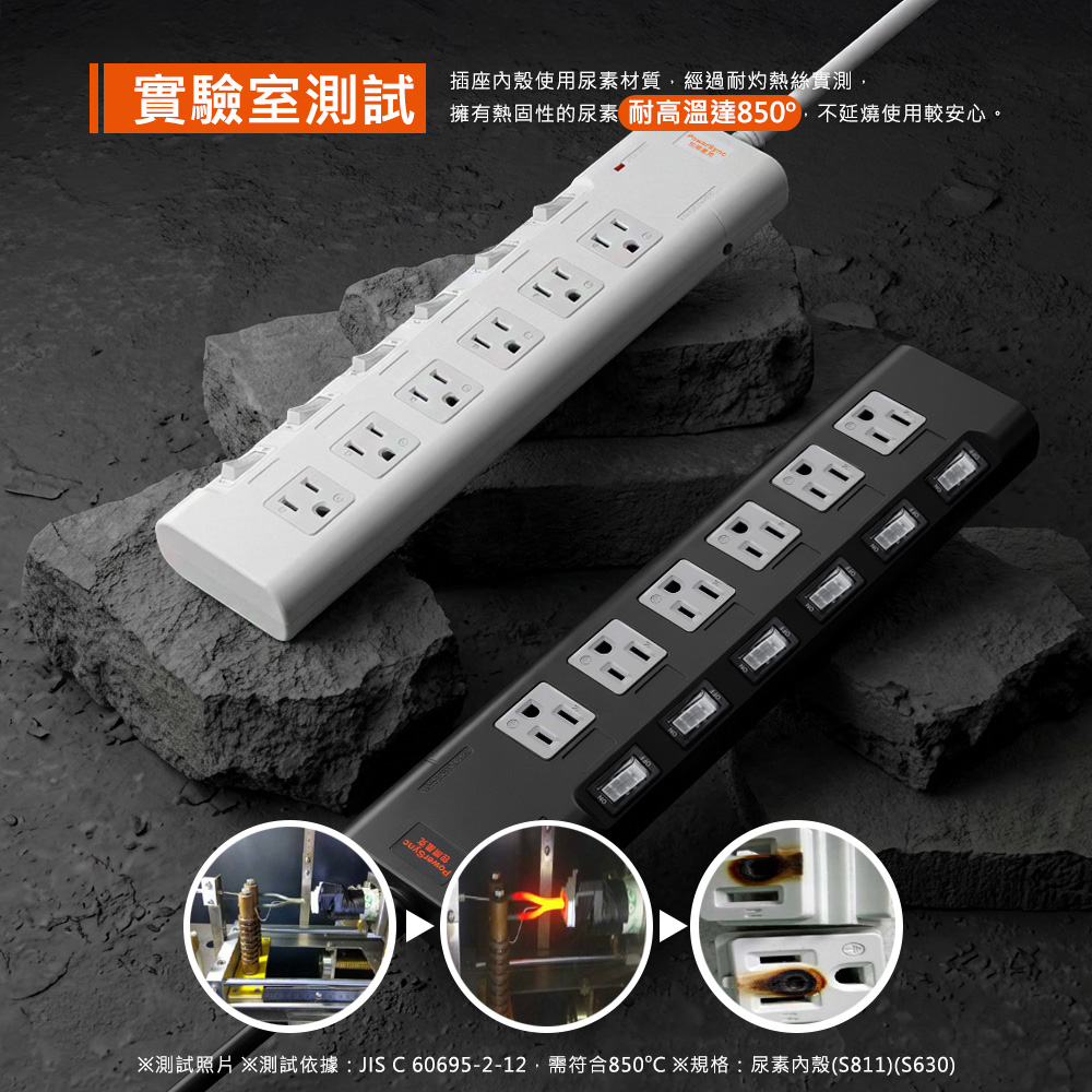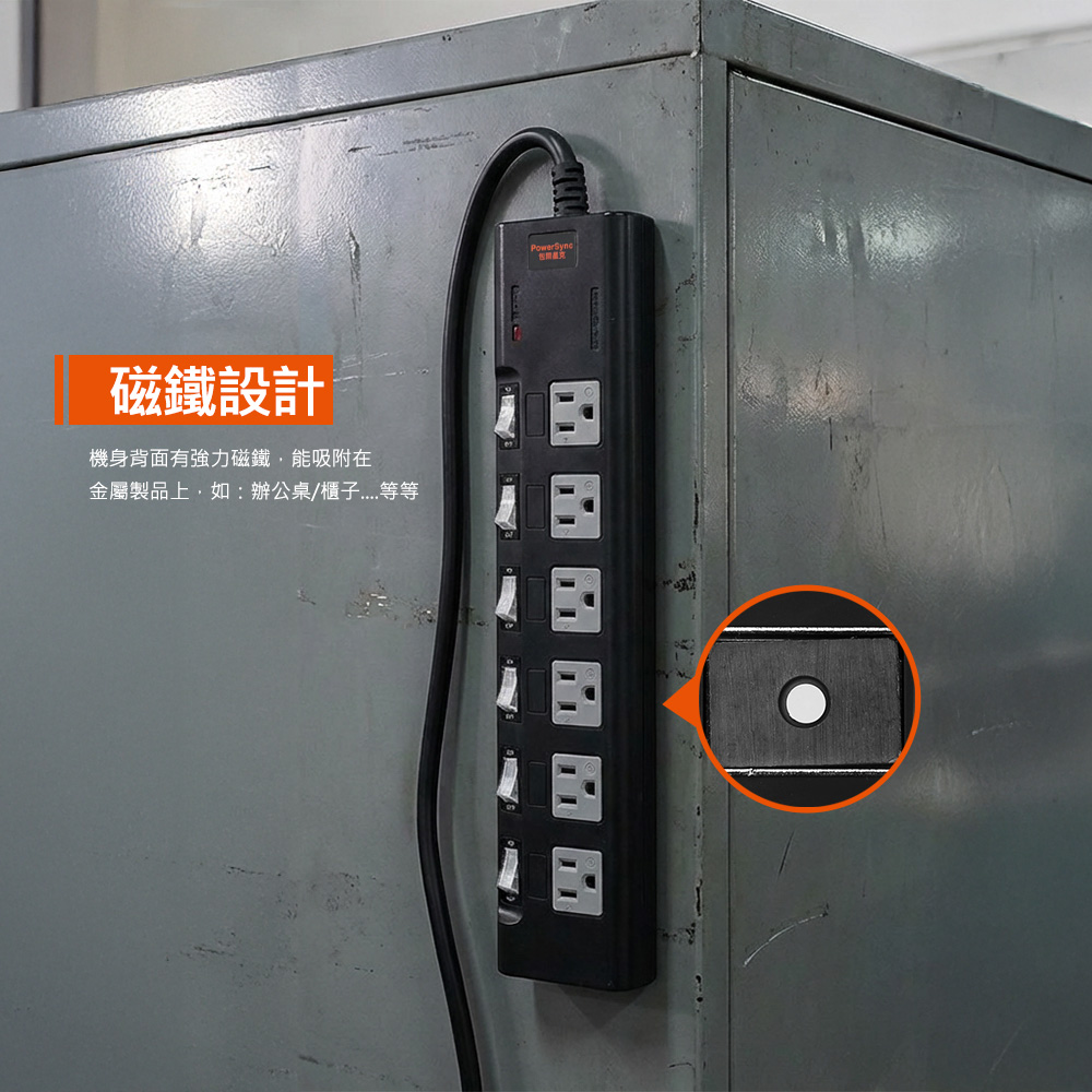 ● 品名:高耐燃六開六插尿素防雷擊延長線(磁鐵固定)黑色