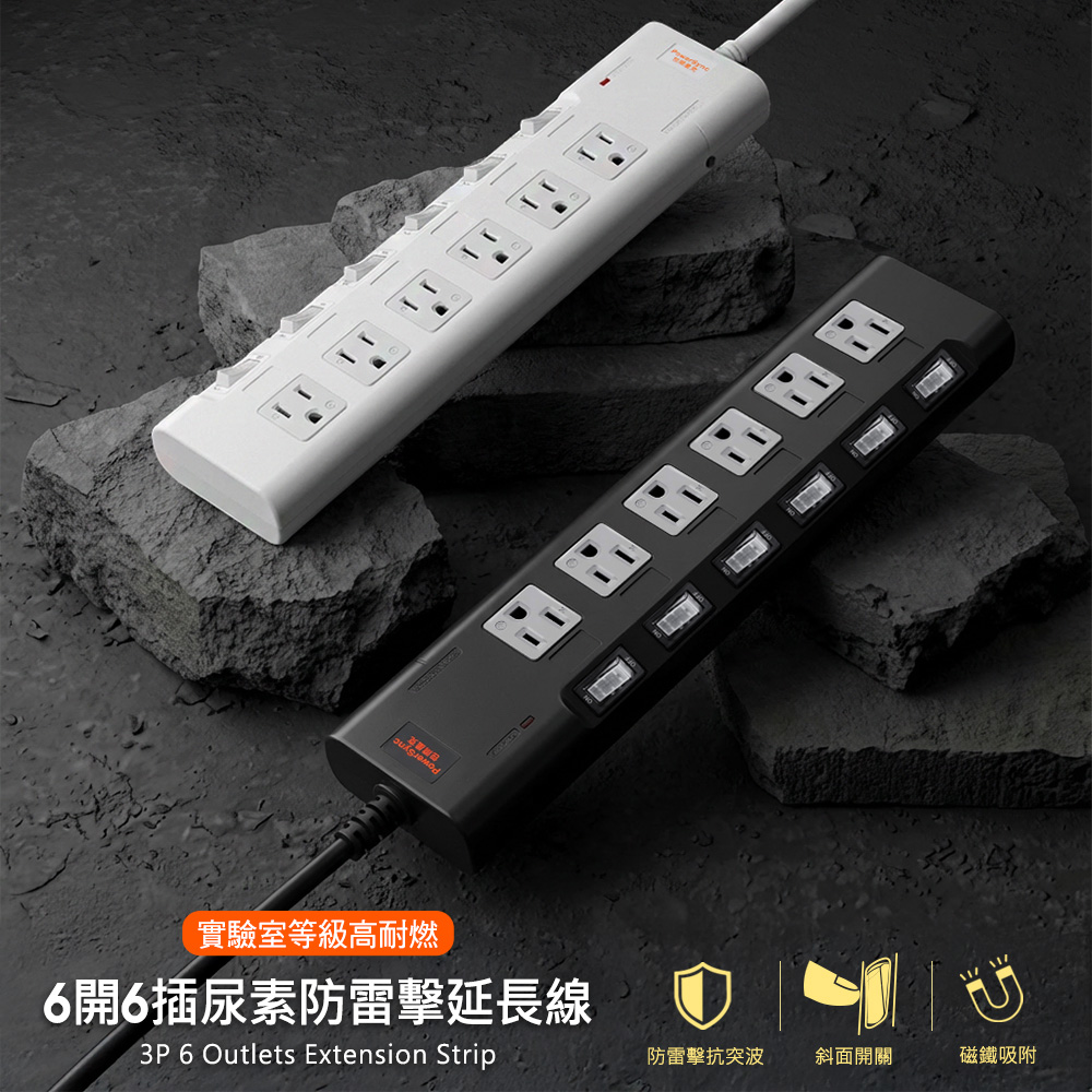 ● 品名:高耐燃六開六插尿素防雷擊延長線(磁鐵固定)黑色