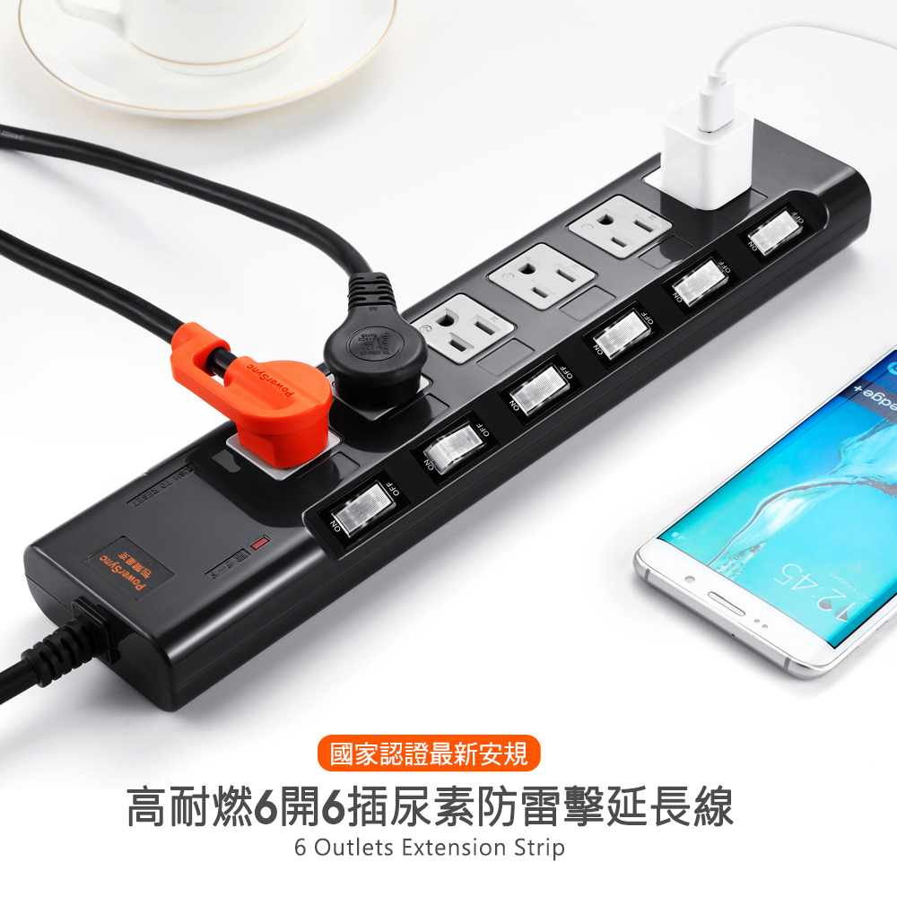 高耐燃六開六插尿素防雷擊延長線(磁鐵固定)黑色