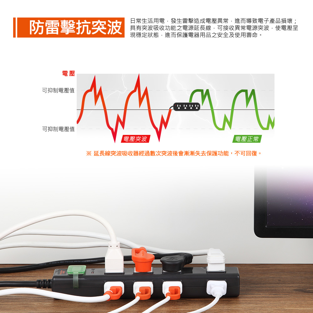 防雷擊抗突波是延長線的一種保護設計,當電力系統因為打雷、突發停電或大型設備運作而產生異常電壓(突波)時,它能即時吸收與抑制這些瞬間電壓,避免家電或電子設備損壞。