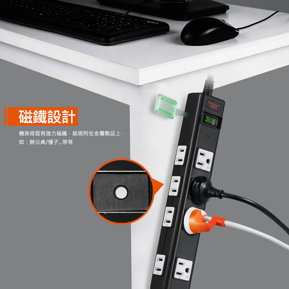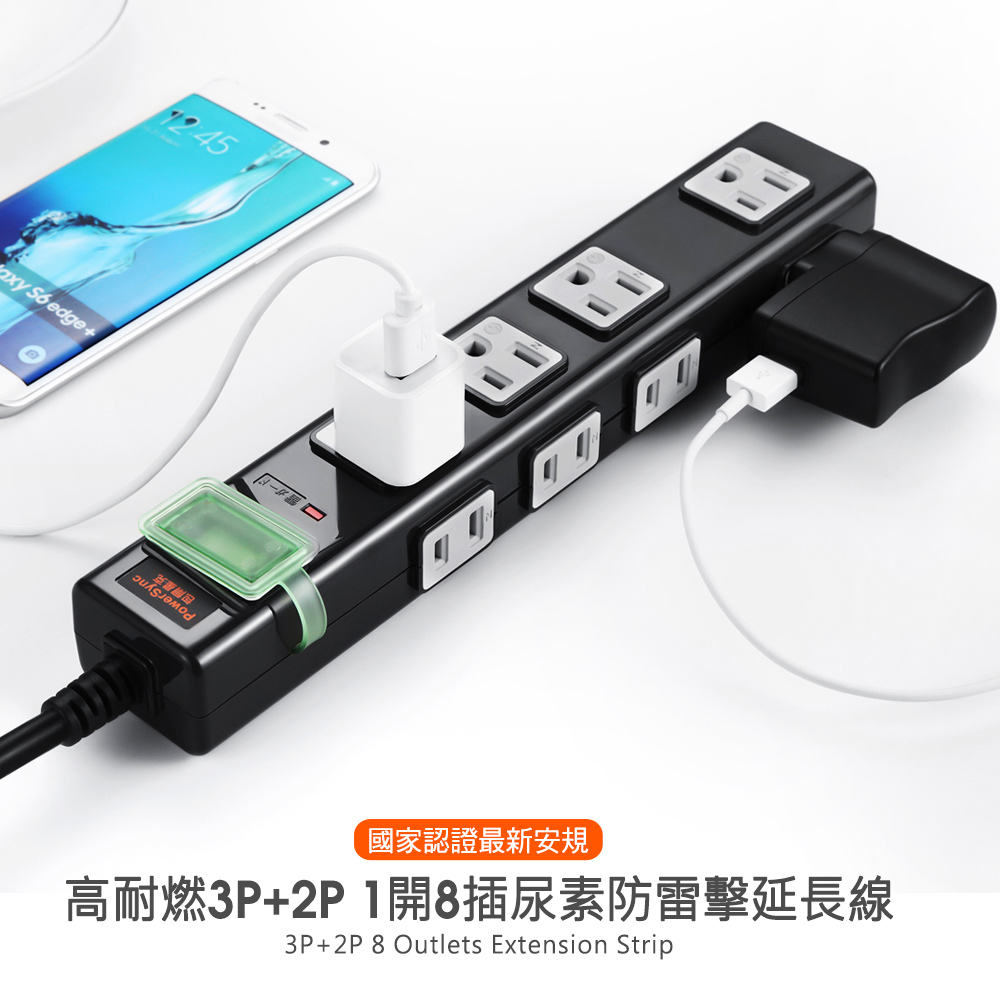 ● 品名:高耐燃3孔+2孔8插尿素防雷擊延長線(磁鐵固定)黑色