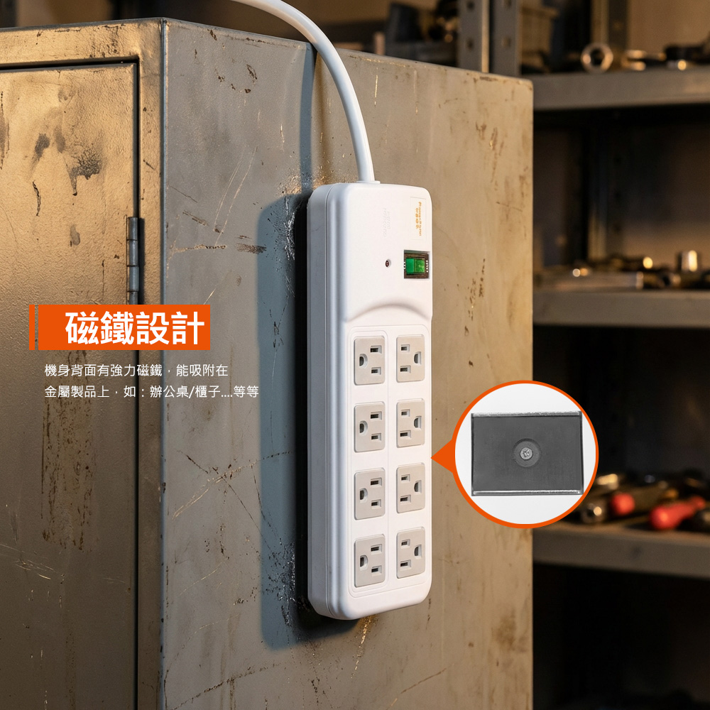 ● 品名:1開8插尿素安全防雷擊延長線(磁鐵固定)