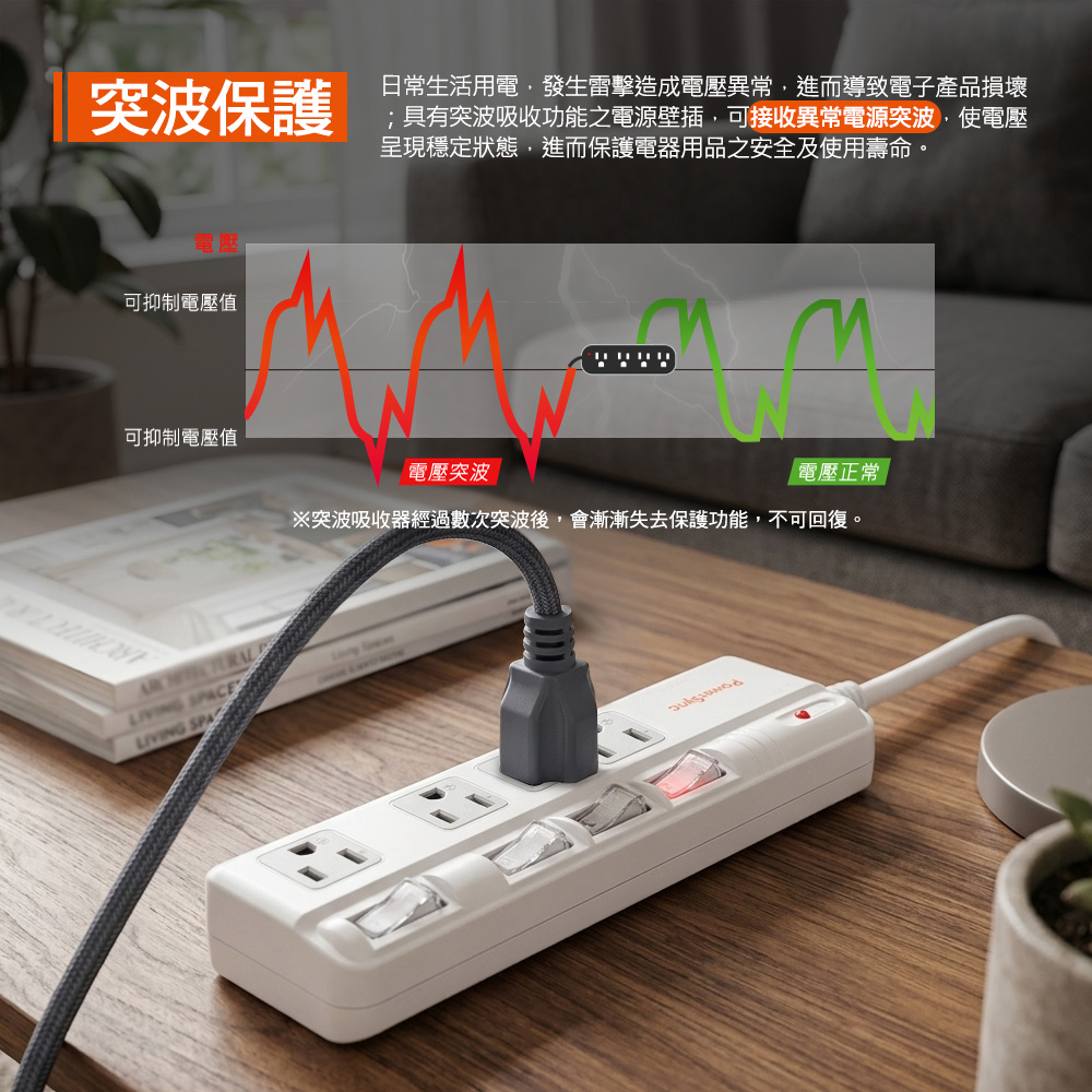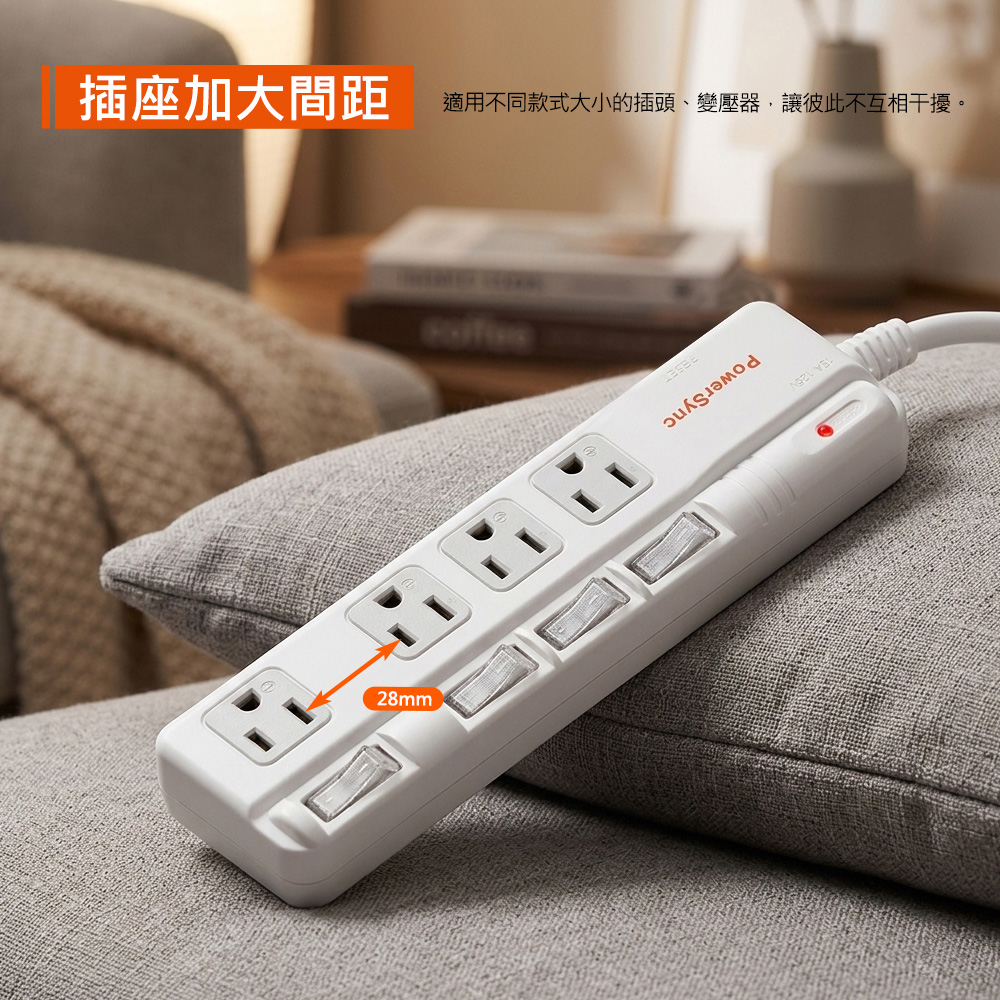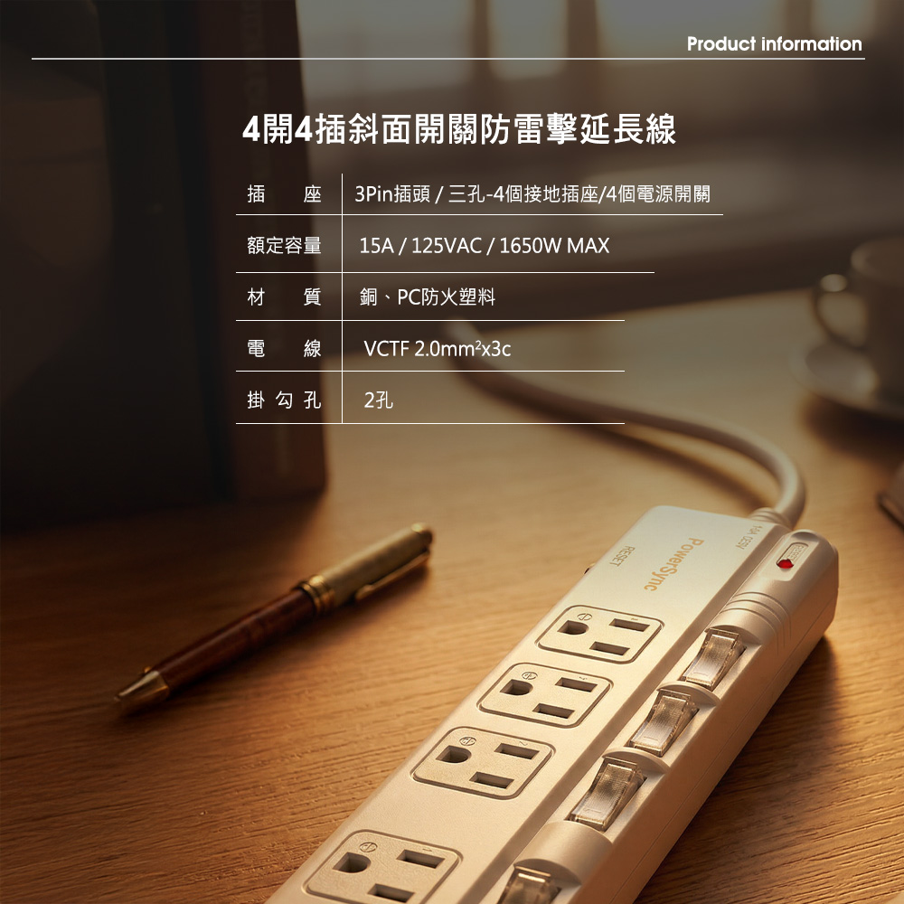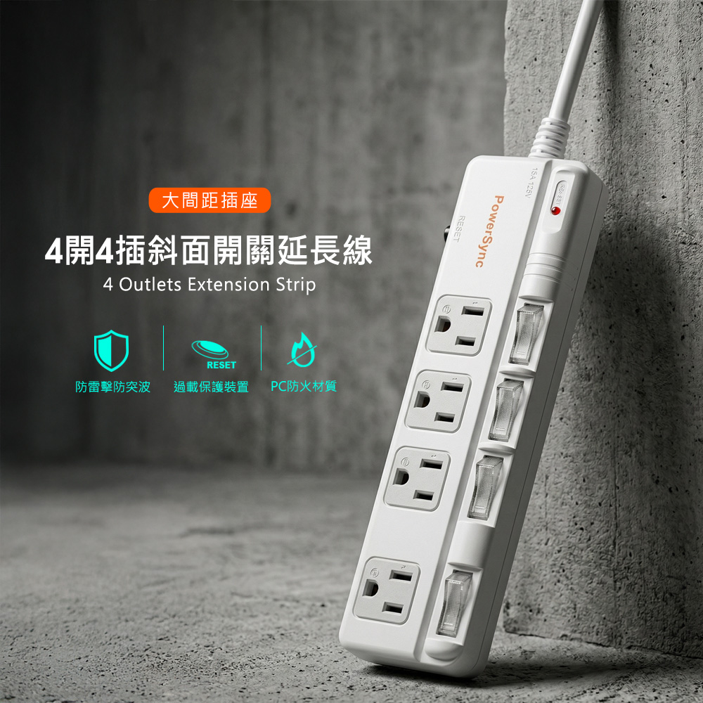 ● 品名:四開四插斜面開關防雷擊抗搖擺延長線