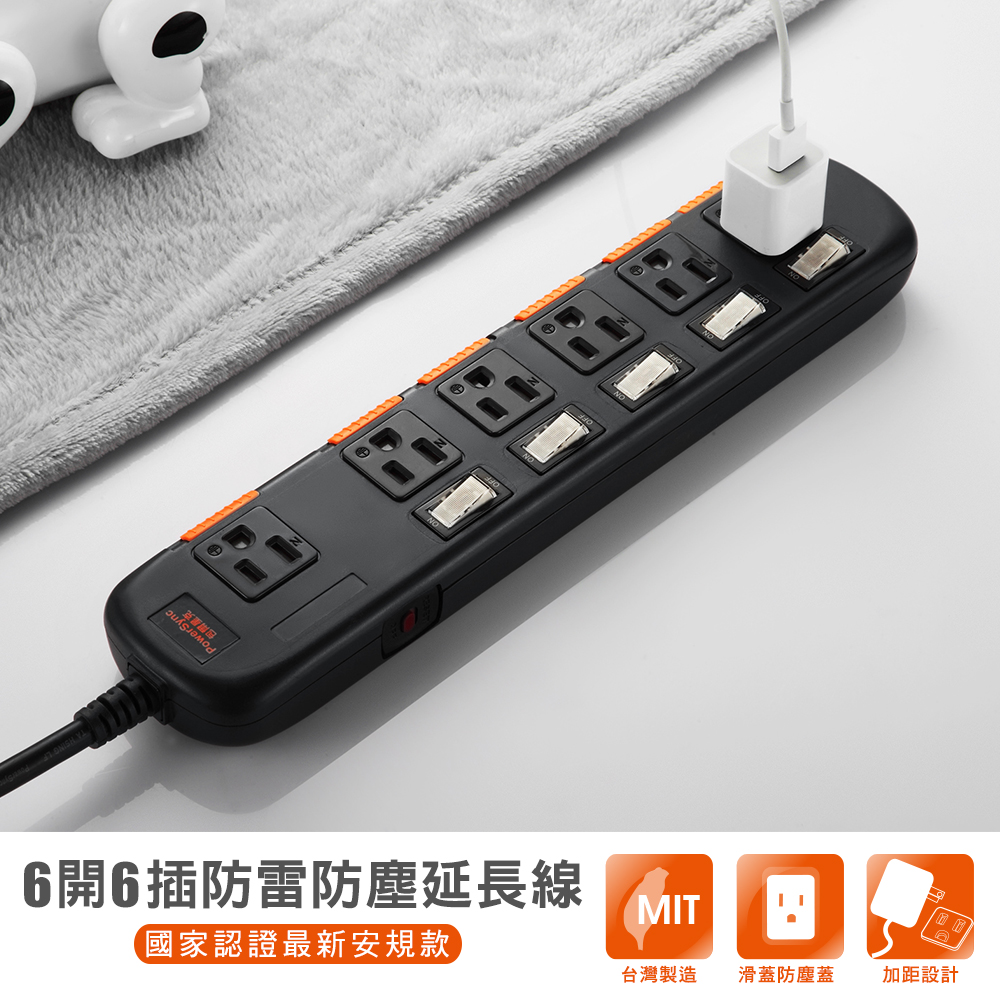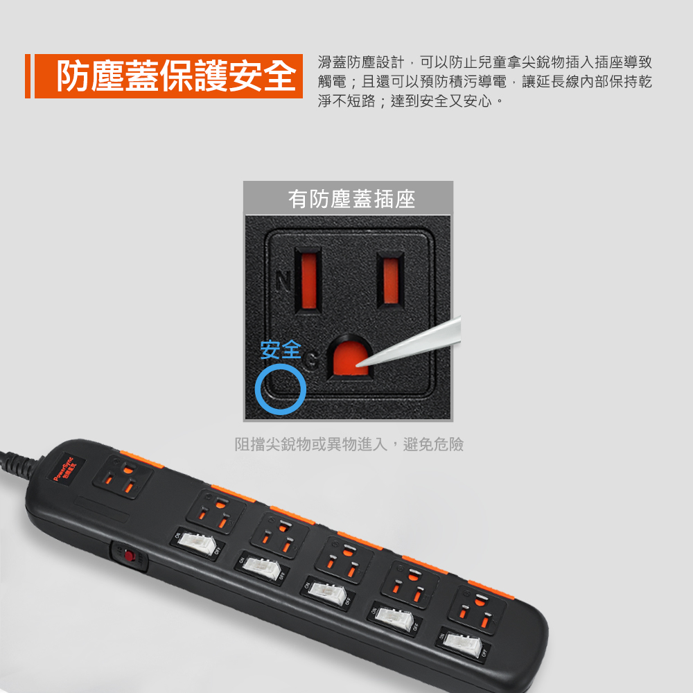 ● 插座:3Pin插頭/三孔-6個插座(防塵蓋設計)/5個獨立開關/1個總開關