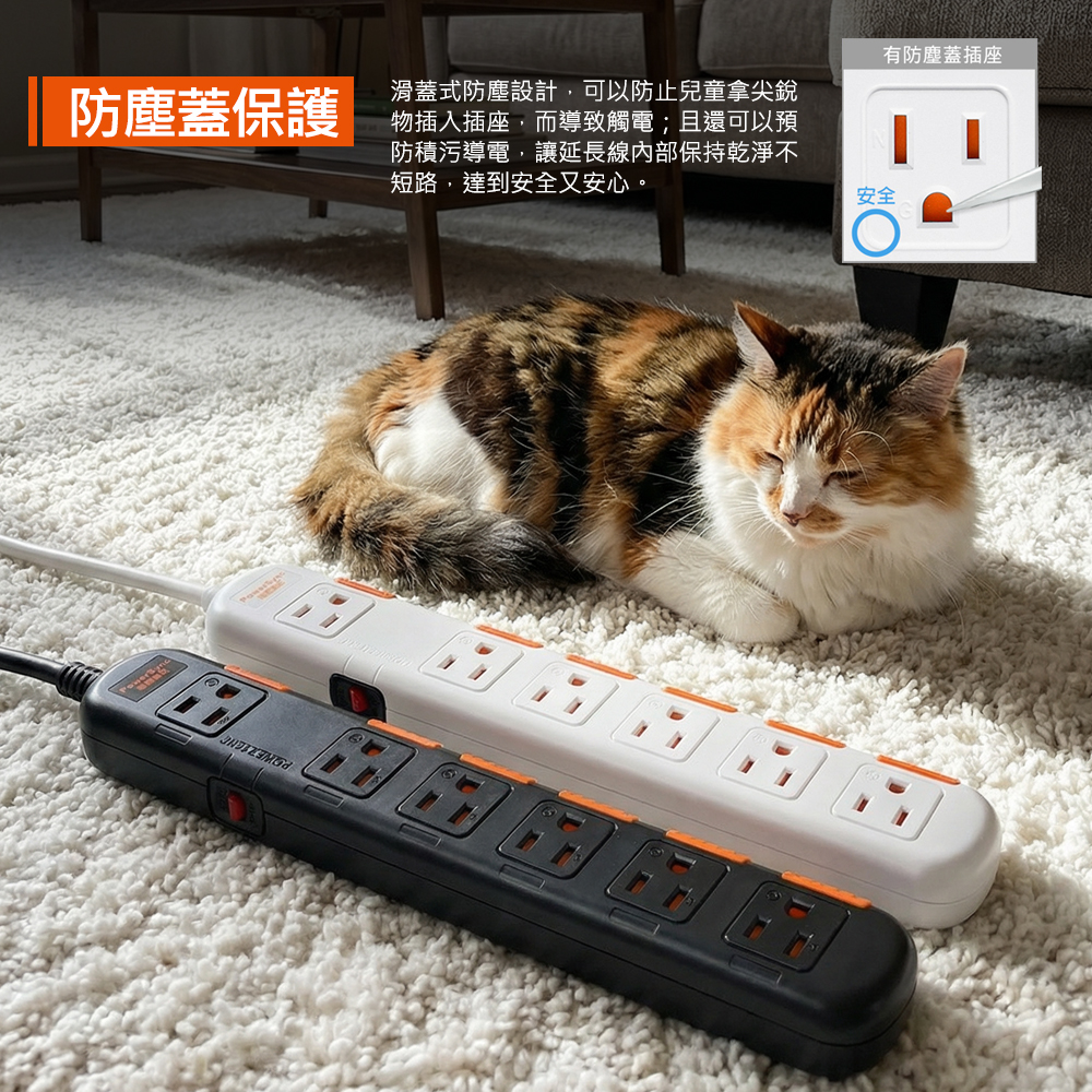 ● 插座:3Pin插頭/三孔-6個接地插座(防塵蓋設計)/1個總開關
