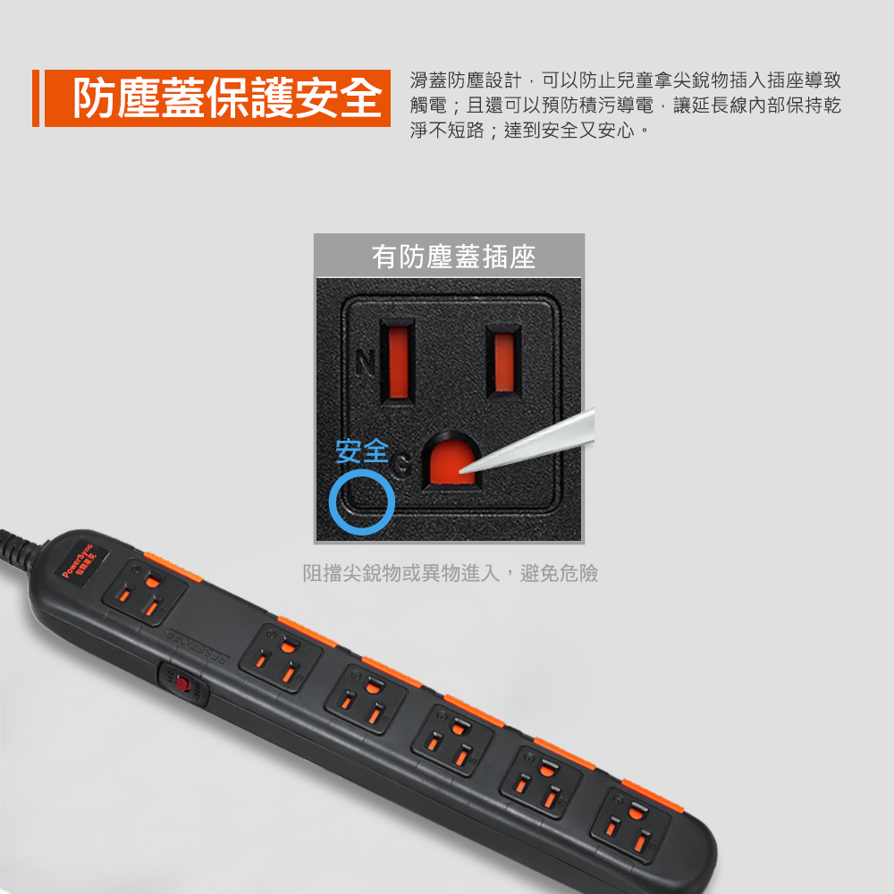 ● 插座:3Pin插頭/三孔-6個接地插座(防塵蓋設計)/1個總開關