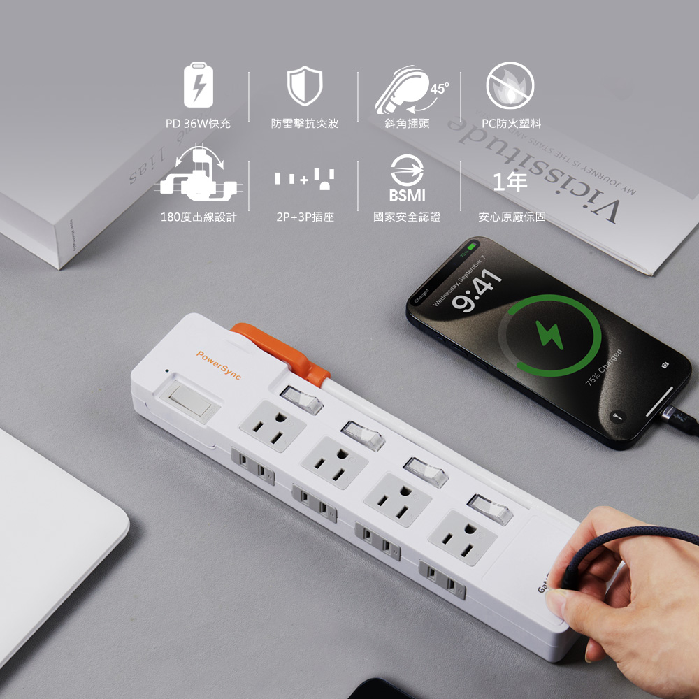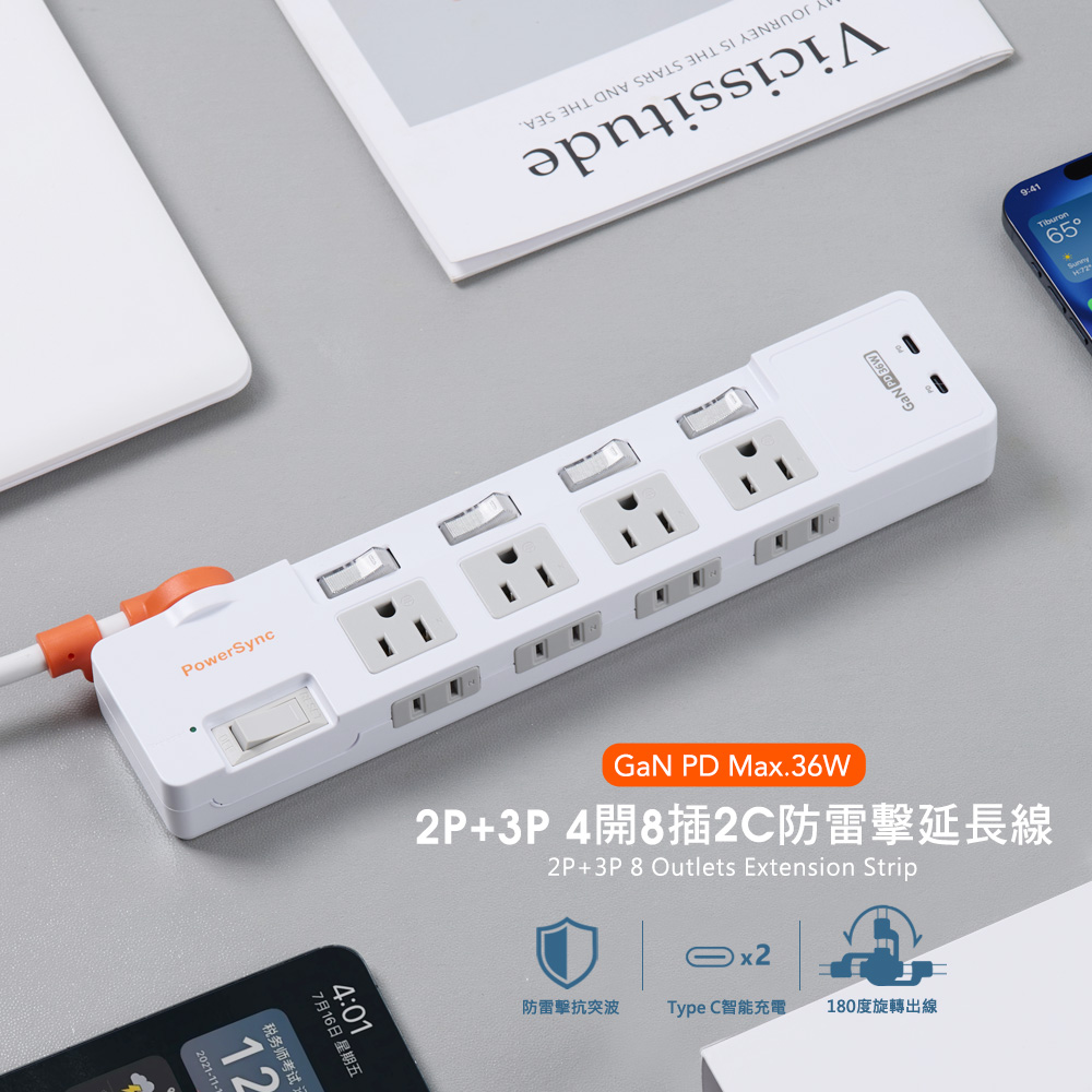 ● 品名:2P+3P 4開8插2C防雷擊抗搖擺延長線