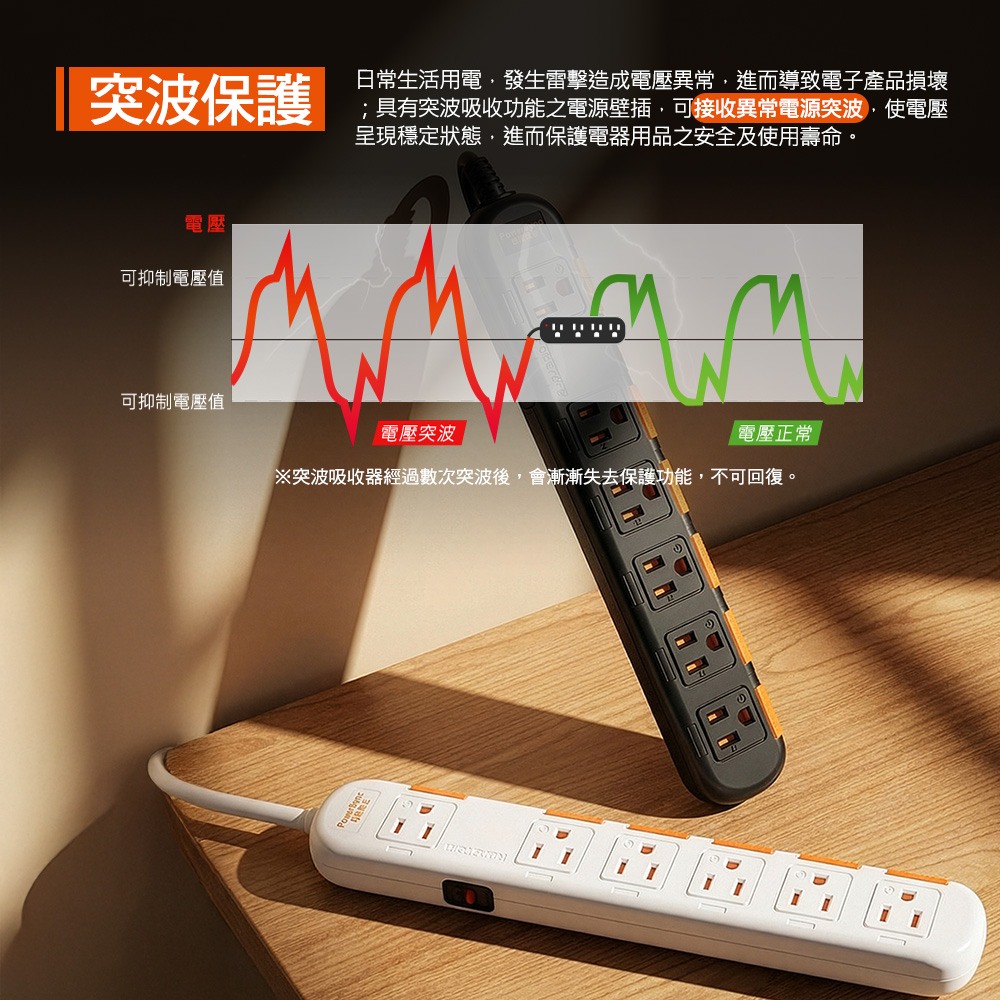 防雷擊抗突波是延長線的一種保護設計,當電力系統因為打雷、突發停電或大型設備運作而產生異常電壓(突波)時,它能即時吸收與抑制這些瞬間電壓,避免家電或電子設備損壞。