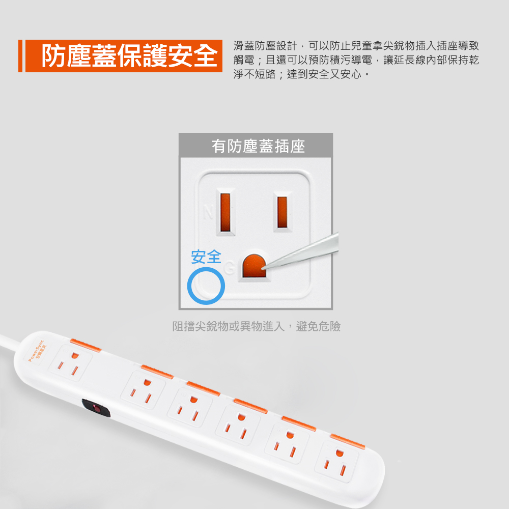 ● 插座:3Pin插頭/三孔-6個接地插座(防塵蓋設計)/1個總開關