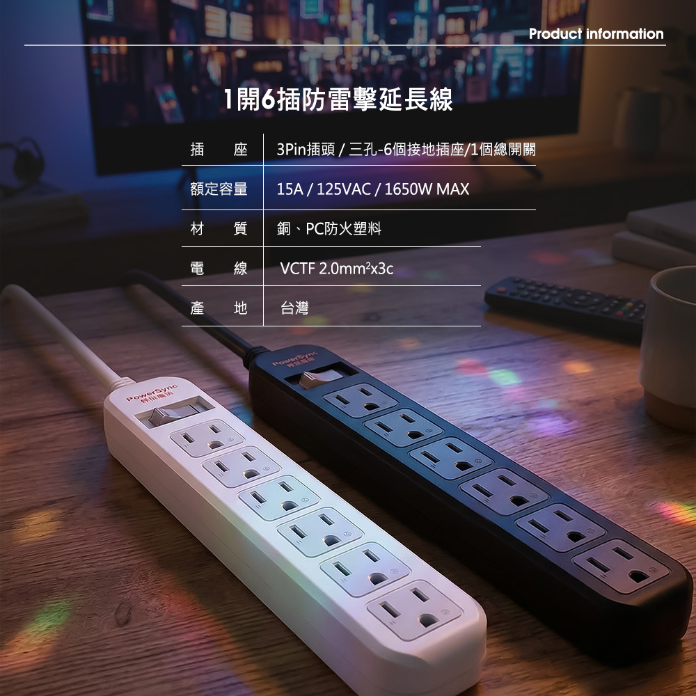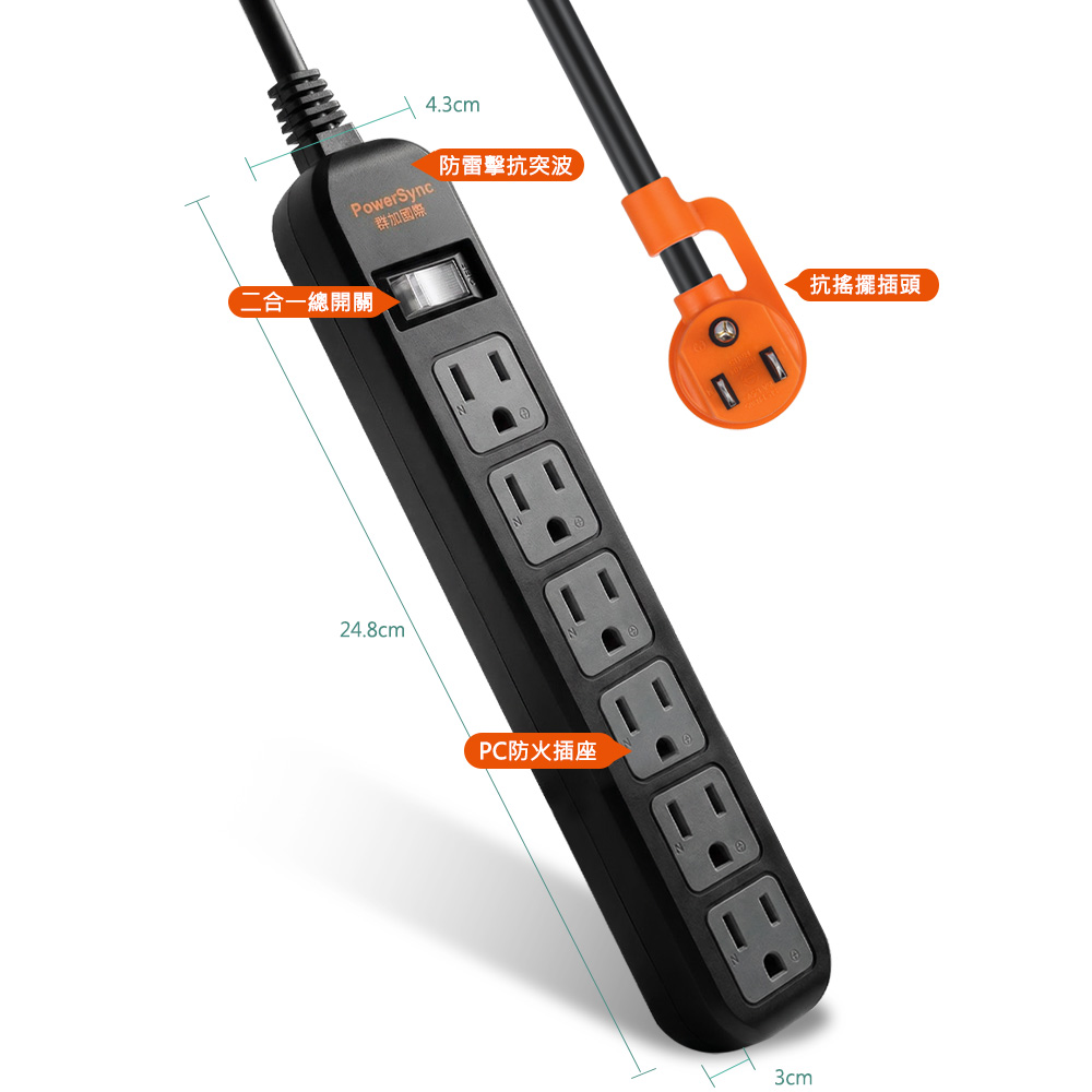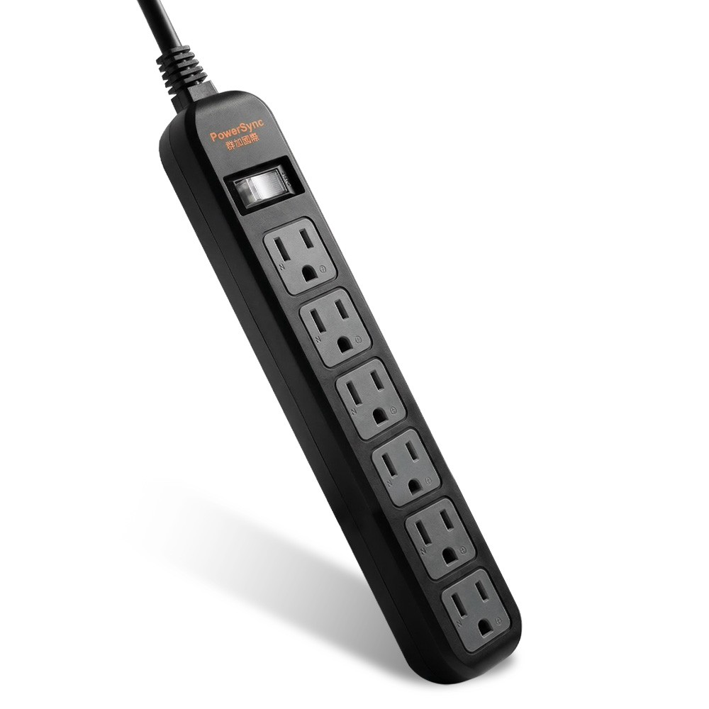 ● 品名:直立式1開6插防雷擊抗搖擺延長線-黑色